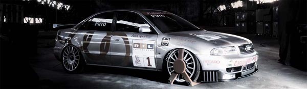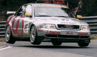 | Die Angst, dass der kleine Hubraum und die strengen Regeln spannende Rennen verhindern wuerden, war uebertrieben, wie man sehen kann. Sogar eine Weltmeisterschaft der Tourenwagen gab es, die der A4 gewann. Da das die Konkurrenz (hauptsächlich BMW) nicht von alleine schaffte, mußte das Reglement nachhelfen. Zusatzgewichte machten Audi buchstäblich schwer zu schaffen. Aber sie gewannen dennoch. Doch die traurige Krönung: Internationales Rennverbot 1998 in der STW-Serie für Allradantrieb. Die Anzeige, in der ein STW-A4 mit einer Radkralle unbeweglich gemacht ist, dürfte wohl eine der besten Anzeigen überhaupt sein. |