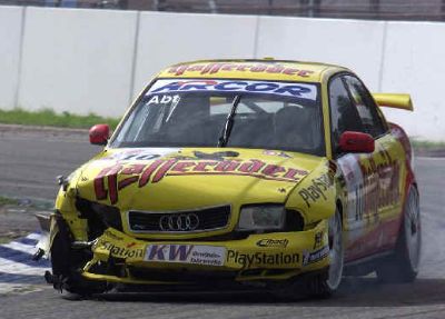 | Das wurde am vorletzten Rennsonntag aufgenommen. Christian Abt wurde von einem überrundeten Opel Privatfahrer torpediert, Uwe Alzen konnte nicht mehr ausweichen und knallte voll in die Schnauze von Christians A4. Abt fuhr an die Boxen, liess den Schaden reparieren und wurde sensationell Dritter im zweiten Lauf, obwohl er von hinten starten musste. Nach dem Rennen wurde er dann aber disqualifiziert, weil seine Boxenleute zu früh (!) zu arbeiten angefangen hätten. |