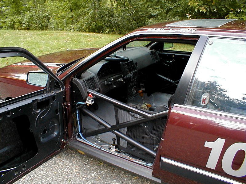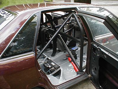 | One of the most important parts of making this limo a racer was the construction of a roll-bar. Larry did it all by himself and came up with a very strong but light piece of art. The car is now much stiffer and handles very crisply. Note the empty door! |