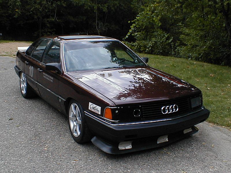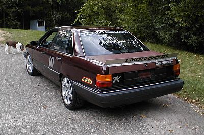 | Thanks to Larry's thoughtful modifications, his car is on one level with the tuned Porsches. Body work include a front spoiler that was built from a second stock bumper that was cut, turned upside down and riveted onto the old bumper. The rear features a spoiler as seen on the Audi 200 Trans Am. You can pretty clearly see that both headlights now work as air intakes. Larry uses an intercooler that can be sprayed with a mixture of alcohol and water. The system is controlled by what was once the controller for the heated seats. It works so well that a Porsche team has built one, too: They use a hightech version with several sensors and using the engine computer unit! |