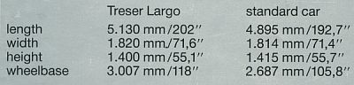 Take a look at these measurements of the US Largo:![]() You see that the difference in length is less than in wheelbase. This is caused by the Treser bumpers which are shorter than the US bumpers. | |