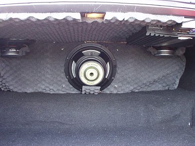 10² directly to the battery, fuse 50A, speakers Kenwood KFC-HQ 718 (7x10", 90W RMS), screwed in from below to the metal using distancers and subwoofer Pioneer TS-W304F (Freeair) on 28mm (1.1") MDF-plate, this screwed with four screws M8x60 and large washers to where once the ski bag was, also applying thick insulation tape and the whole trunk is laid out with special noise absorbing polymeric foam, including the rear lid and below the rear window.