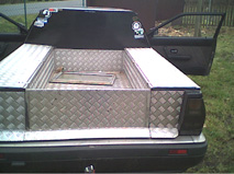 Da die hinteren Kotflügel weit in die Wagenmitte reichen, sind sie mit Aluminium-Trittplatten verkleidet und fungieren jetzt als Staufächer. Keine schlechte Idee, denn Sachen einfach bei Wind und Wetter auf die Ladefläche zu legen ist ja oft nicht empfehlenswert. |