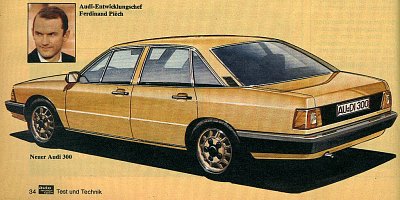 ![]() (1) | auto motor und sport, issue July 79: The Type43 is not old then, but the press is already developing a successor, the "Audi 300". Without any knowledge (at that time) the concept looks like a smoothed Type43 with elements from the Ro 80, especially in the rear. Not bad at all, but wrong. Suspected was a "nearly sensational" cD coefficient of 0.30 (correct) amd the usage of a inline sixcylinder (wrong). About six months before the introduction of the quattro, the press was sure that the Audi 300 would be equipped with frontwheel drive. It must be noted that the 300 should probably not replace the Audi 100/200 but be a new car, a successor to the Ro 80 in some way. More to that further down. |