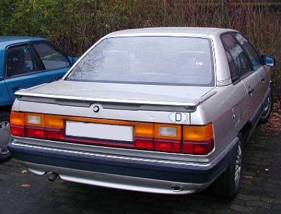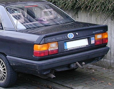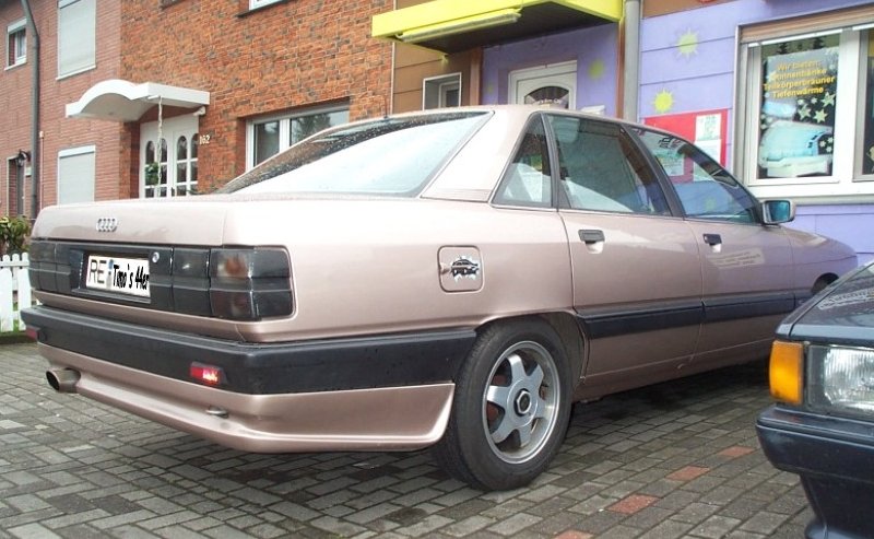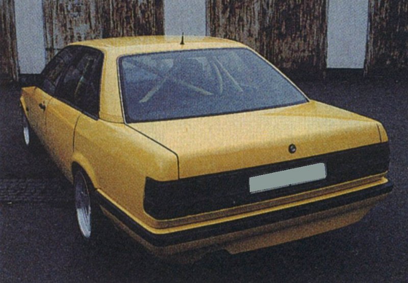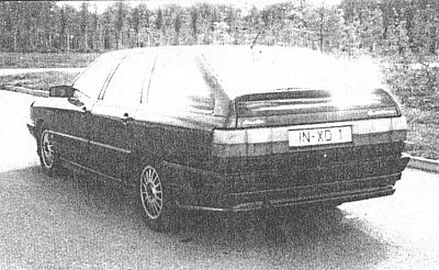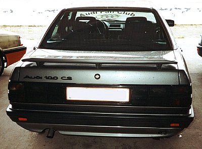 | This Audi 100 was presented in the magazine "Autotuning" as one of the the first two cars by MA-Spezial. It has some unique ideas. It has a painted Audi 200 bumper with blacked out turning signals. The fog lights are replaced with air intakes and the now useless Audi 100 signals are covered. The wheel arches are cut out and welded in a bit higher. That way, 215/40 on 8,5x17 will fit, even with a lowering of 120mm (4.7"). A roll cage was added to the interieur, the rear door handles are smoothed and a Kamei grill spoiler is mounted. (6)rear view (87kB) |